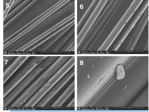 上圖1~4是纖維樣品在不噴金,低真空模式下拍攝的圖片。1、2為背散射圖像,3、4為二次電子圖像,在兩種圖像模式下,Axia均表現(xiàn)出優(yōu)異的成像功能。AxiaChemiSEM提供的低真空模式,可調(diào)節(jié)壓力到zui高150Pa,支持各種不同的樣品。
