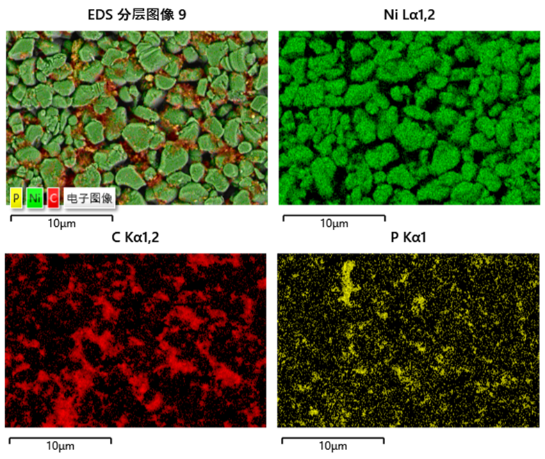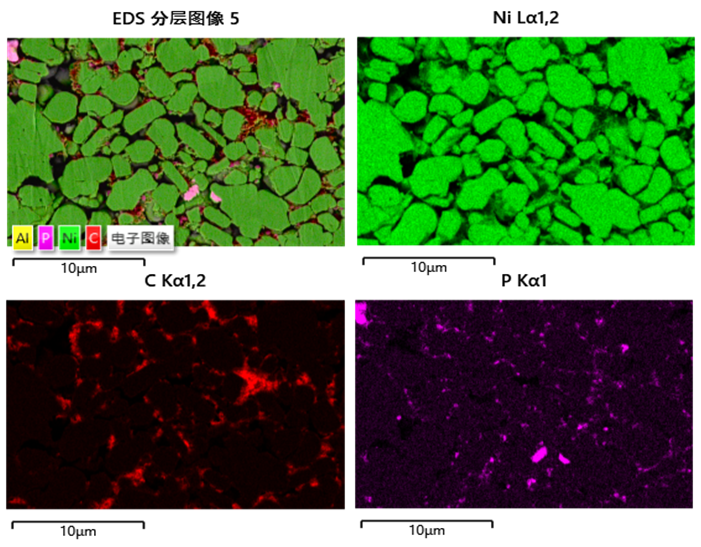 因為已經確定添加物的種類,就可以通過單一的元素來代表相應的物相,比如P代表LATP,C代表CNT、SP、粘結劑等混合相,Ni代表NCM正極顆粒。從圖2中,可以看出LATP、NCM等各種材料的分布。CNT、SP、粘結劑主要分布在正極顆粒之間,LATP也不均勻的分布在正極顆粒之間,但正極顆粒表面是否還額外的存在LATP納米包裹層,僅從EDS的Mapping圖中看,是不能被證實的(5KV激發的信號深度遠大于包裹層厚度)。因此,為了更好的辨別NCM的晶體類別和LATP包裹層的存在,需要觀察離子拋光后的截面。