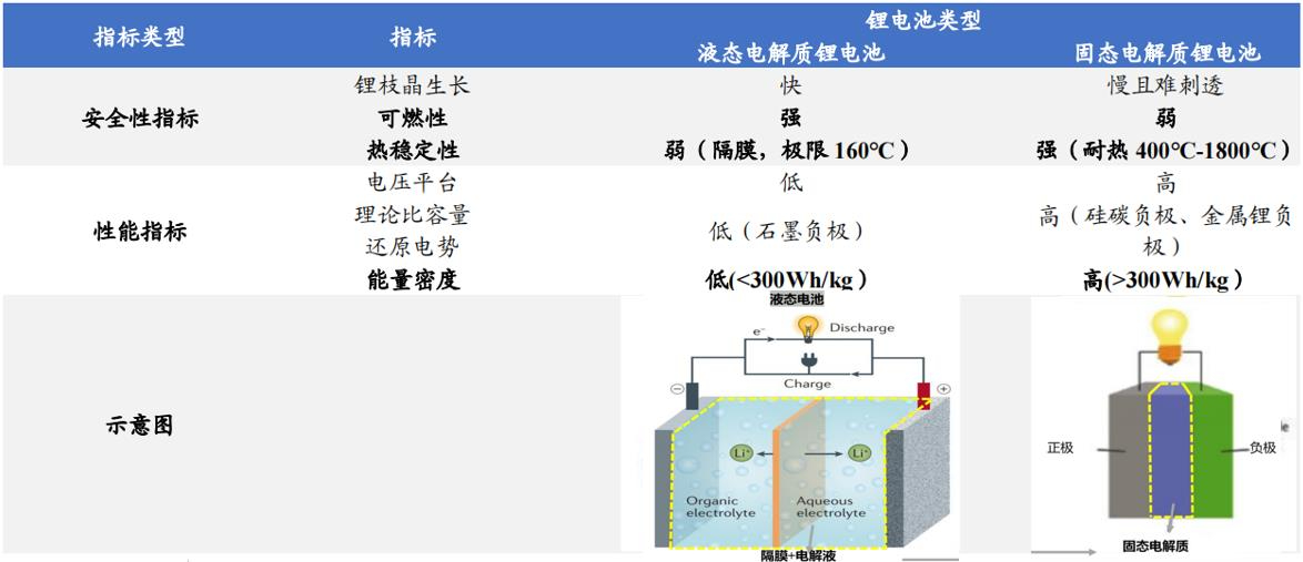 固體電解質不存在隔膜刺穿等易燃等安全問題, 相比傳統鋰離子電池,固態鋰離子電池安全性更好且有更優越的綜合性能:鋰枝晶在固態電解質中生長緩慢且難刺透,可燃性更差,熱穩定性更強(氧化物固態電池極限溫度 1800℃),采用高鎳正極、硅碳負極、預鋰化、金屬鋰負極等,能量密度可突破300Wh/kg,甚至達到500Wh/kg1。因此,發展固態鋰電池技術是解決液體電解質鋰電池安全問題的根本途徑。