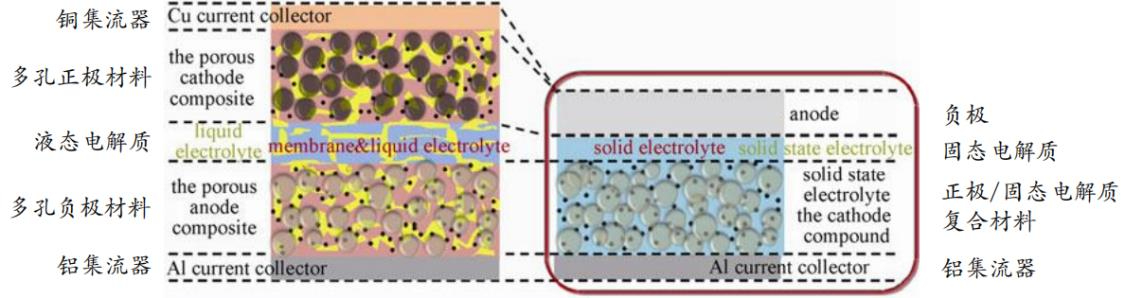 圖3 液態電池與全固態電池結構設計比較
