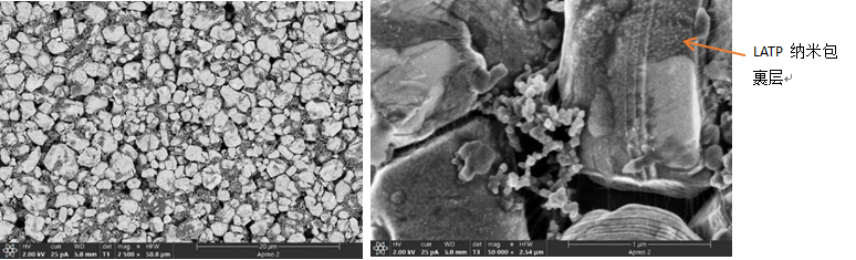 圖1 (左)正極極片表面形貌;(右)NCM顆粒表面細節形貌