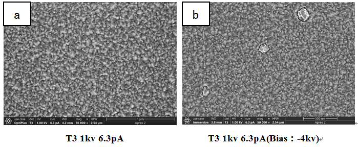 圖3為用賽默飛場(chǎng)發(fā)射掃描電子顯微鏡Apreo 2S 在optiplan模式下拍攝的ZnO薄膜,由圖(a)、(b)可見,制備出的膜層均勻致密、無孔隙。但(b)較(a)圖片相比,噪點(diǎn)更少、分辨率更高。這是因?yàn)椋╞)較(a)參數(shù)上增加使用了樣品臺(tái)減速模式,使用減速模式后,電子束依然保持高電壓,在試樣臺(tái)上加載一個(gè)負(fù)電位,電子在出極靴后受到負(fù)電位的作用而不斷減速,以低能狀態(tài)著落在樣品表面。這樣既保持了高電壓的分辨率,又因?yàn)榈椭潆妷憾泻芨叩谋砻骒`敏度。