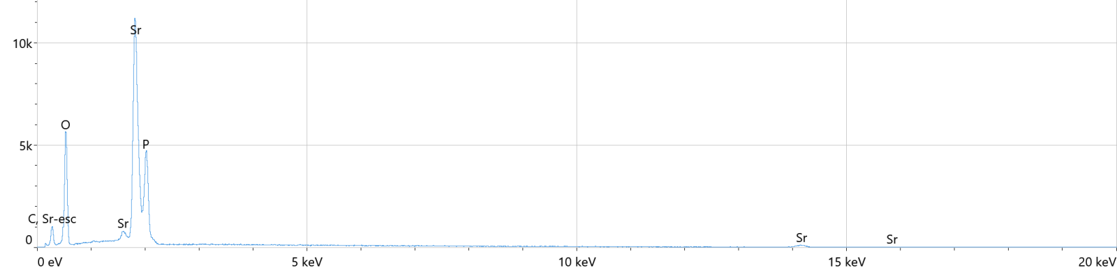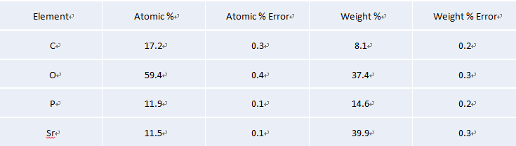 利用Axia ChemiSEM掃描電鏡標配的能譜對鍶磷化膜的表面進行成分分析,分析結果如下,從能譜的結果中我們可以清晰的知道該膜層含有C、O、P、Sr元素,分析結果準確、高效。