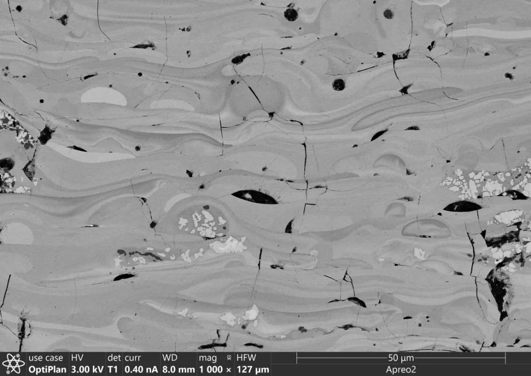 根據(jù)通道效應(yīng)的特征,其在材料領(lǐng)域具有非常廣泛的應(yīng)用。鋰離子電池三元正極材料的單個(gè)粉末顆粒是由許多不同取向的小晶粒構(gòu)成,通過(guò)氬離子研磨儀對(duì)顆粒進(jìn)行精細(xì)研磨,從而獲取平整光潔的截面。在賽默飛Apreo 2掃描電鏡的T1背散射探測(cè)器的幫助下,可以輕松獲取顆粒的通道效應(yīng)襯度像,進(jìn)而清楚觀察到各個(gè)晶粒的取向,見(jiàn)圖4。在鋼鐵行業(yè),我們需要觀察金屬內(nèi)部的晶粒取向、晶粒形狀、位錯(cuò)情況等,來(lái)改善金屬的制造工藝。見(jiàn)圖5,通過(guò)T1背散射探測(cè)器觀察到不同取向的晶粒、不同的成分襯度、不同的晶粒形狀等豐富信息。圖6展示了陶瓷材料的通道效應(yīng)襯度像,以不同的灰度來(lái)一目了然地區(qū)分不同取向的陶瓷晶粒。