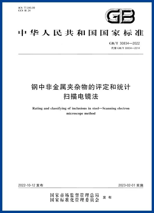 國家標準《鋼中非金屬夾雜物的評定和統計掃描電鏡法》 由TC183(全國鋼標準化技術委員會)歸口,TC183SC14(全國鋼標準化技術委員會金相檢驗方法分會)執行 ,主管部門為中國鋼鐵工業協會。主要起草單位為首鋼集團有限公司 、冶金工業信息標準研究院 、北京歐波同光學技術有限公司 、江陰興澄特種鋼鐵有限公司 、中航試金石檢測科技(大廠)有限公司 、張家港聯峰鋼鐵研究所有限公司 、北京安科科技集團有限公司 、西寧特殊鋼股份有限公司 。