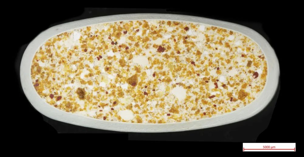 我們選取了一款市面上常見的復合維生素片,其拋開表面光鏡照片如上圖所示。通過光鏡圖像,我們大致了解到該藥片包含多種成分,且顆粒大小不一,外層存在一層包衣用作保護藥片。但當我們想進一步放大觀察,或者探究各個位置的元素分布情況時,該圖像顯然無法滿足我們的要求。