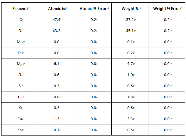 通過對比維生素片產(chǎn)品信息表,再結合實時能譜分布圖像,我們找到了維生素片中主要成分的分布情況。比如:鈣(來源于檸檬酸鈣)、鎂(來源于重氧化鎂)、鉀(來源于硫酸鉀)、鐵(來源于富馬酸亞鐵)、錳(來源于錳氨基酸螯合物)等等。進一步分析,我們可以確定硫酸鉀和氧化鎂的位置,從而獲得其尺寸大小及形態(tài)分布,這對于我們調控生產(chǎn)工藝至關重要。同時,元素的定量結果如下表所示。
