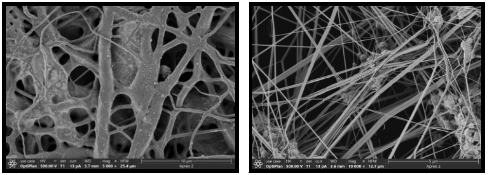 掃描電鏡作為觀察樣品微觀形貌的主要方法之一,具有高景深、高倍率、樣品制備容易等多個特點。但對于堆積較厚且不均勻的靜電紡絲樣品而言,不易得到清晰高倍的無損圖像。賽默飛超高分辨場發射掃描電鏡Apreo 2兼具高質量成像和多功能分析性能于一體,采用雙引擎技術,超低電壓下可直接分析不導電樣品,且無需做任何噴鍍處理。如下圖6所示,直接將靜電紡絲樣品置于Apreo 2電鏡中,在500V低電壓下輕松成像,樣品無荷電且無損傷。并且憑借快捷的FLASH功能,設備可自動執行精細調節動作,只需移動幾次鼠標,就可完成必要的合軸對中、消像散和圖像聚焦校正,即使電鏡初學者也能充分發揮Apreo 2的性能。