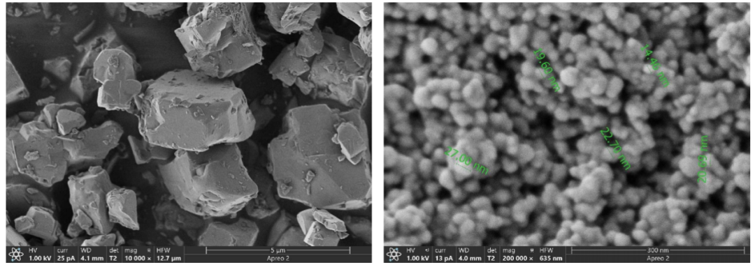 研磨前(左圖)和研磨后(右圖)對比,研磨后的顆粒為20nm左右,可以對砂磨機的研磨效果進行評估。