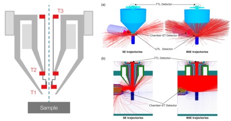 而掃描電鏡Apreo2在低加速電壓上做的性能優化,非常適合陶瓷納米粉體的拍攝。以下是Apreo2鏡筒的設計示意圖及鏡筒內信號示意圖。