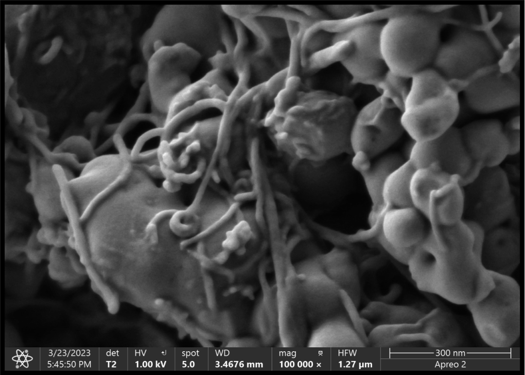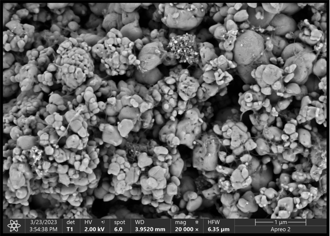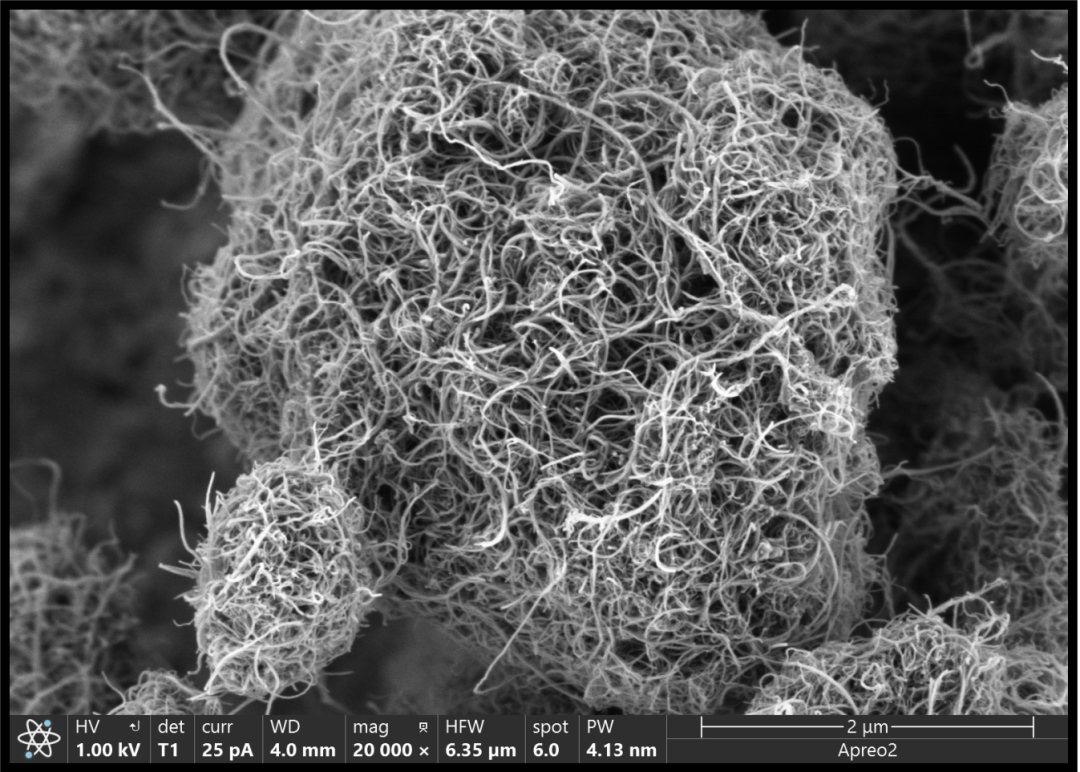 另外碳納米管相比碳黑等材料也具有更優(yōu)良的導熱性能,可以促進電極材料中熱量的傳遞和耗散,避免局部生成熱點影響電池體系的安全,碳納米管與電極活性材料相互纏繞也使電有一定的韌性,不容易在充放電過程中發(fā)生活性物質(zhì)的剝離。在用Apreo 2S掃描電子顯微鏡的T2高分辨二次電子探測器我們可以很清晰的觀察到CNTs的結構在磷酸鐵鋰正極粉體材料中很好地保留。