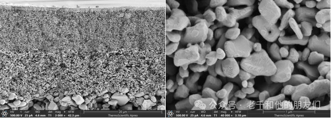 圖1 陶瓷過(guò)濾膜截面。低加速電壓不鍍金成像,可辨別支撐體上不同孔尺寸的3層過(guò)濾膜,膜層顆粒堆積的形態(tài)以及顆粒表面細(xì)節(jié)。圖注:著陸電壓500V,減速電壓2KV,束流25pA,賽默飛Apreo2T1探測(cè)器。