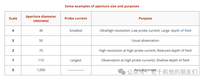 下表列出了一些光闌大小和實(shí)際用途的例子。不同光闌可使用數(shù)字刻度。例如,可以使用1、2、3和4。根據(jù)儀器的不同,可以用的數(shù)字表示的光闌直徑,也可以用的數(shù)字表示小的光闌。