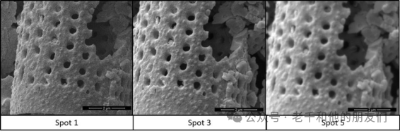 下圖是在三種不同束斑尺寸下拍攝的硅藻。在束斑尺寸(束斑5)下,圖像顯示的細(xì)節(jié)少于小束斑尺寸(束斑1)。不過(guò),在小束斑尺寸下,圖像的信噪比有所降低。