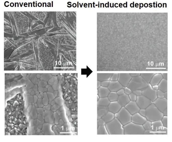 掃描電鏡是了解不同溶液和沉積技術對鈣鈦礦層表面改善的重要工具。通過分析SEM顯微照片,可以優化鈣鈦礦的制備方法,從而大大提高器件的性能。如圖1所示的鈣鈦礦層的SEM圖像,比較了常規自旋鍍膜法制備的MAPbI3層和在自旋過程中使用氯苯誘導快速結晶制備的MAPbI3層。結果顯示常規方法制備的鈣鈦礦層內形成了較大的孔洞;但是通過溶劑誘導法則形成了完全覆蓋的均勻層。