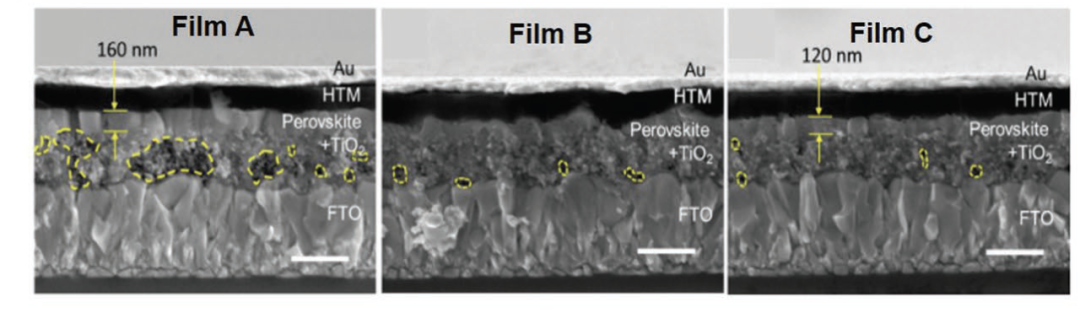 為了對薄膜表面進行成像,包括不同層(the electron and hole selective layers )以及鈣鈦礦薄膜層,通常不需要表面金屬化,因為這些層通常沉積在導電襯底上,如氟摻雜氧化錫(FTO)。但前提是SEM拍攝時所選取的電壓不能過高,否則會掩蓋薄膜表面的細節,這對電鏡的光路系統有著非常嚴格的要求。
