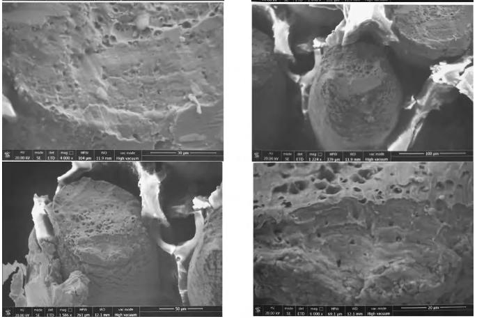 利用掃描電子顯微鏡下對斷口進行觀察,發現屏蔽網芯線的斷口均存在明顯的縮頸現象,且中部終斷區為韌窩形貌,從斷口形貌判斷,屏蔽網應為受到外力作用產生塑性斷裂;中心芯線的斷口較為平齊,表面為扭轉形態的剪切窩形貌,從其形貌判斷,中心芯線受到扭轉應力作用導致中心芯線扭斷,斷口微觀形貌如下圖所示。