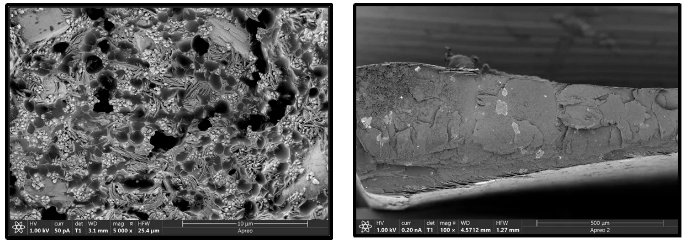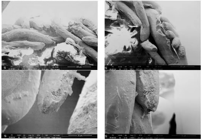 如下圖所示,為導電性極差的高分子涂料和聚乙烯樣品,利用低電壓進行拍攝,且樣品表面無需要做任何導電化處理,結果顯示樣品表面無荷電產生,表面細節清晰。