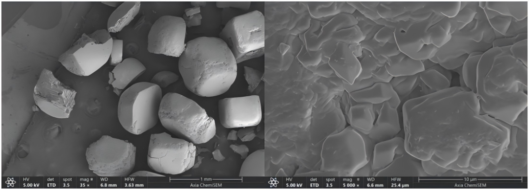 優(yōu)質(zhì)的白砂糖微觀結(jié)構(gòu)均勻細(xì)膩,顆粒大小均勻,晶體形態(tài)規(guī)整,色澤純白。這種微觀結(jié)構(gòu)能夠使砂糖在溶解、吸濕、儲(chǔ)存等方面表現(xiàn)出良好的性能。而質(zhì)量較差的白砂糖微觀結(jié)構(gòu)不均勻,顆粒不規(guī)則,可能帶有雜質(zhì),影響了砂糖的溶解、甜度和口感。因此,微觀結(jié)構(gòu)是影響白砂糖品質(zhì)的重要因素之一。如圖2所示,采用Axia ChemiSEM獲得的結(jié)果,相比于食用鹽,微觀下白砂糖顆粒棱角更加分明,表面平整光滑。