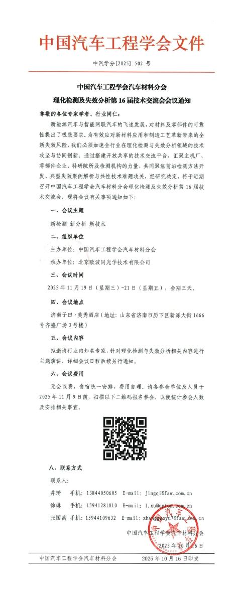 活動發布|中國汽車工程學會汽車材料分會理化檢測及失效分析第16屆技術交流會會議通知