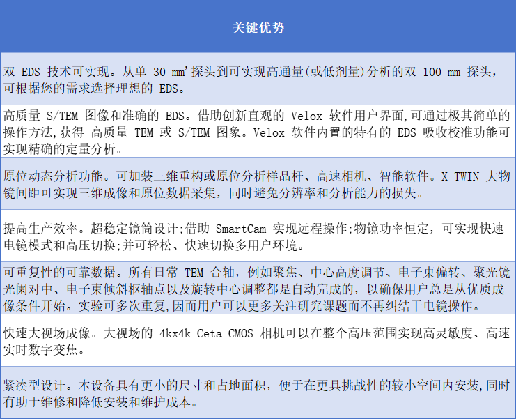 Talos F200i標準的 X-TWIN 物鏡極靴間距在應用中具有靈活性,結合高再現性能的鏡筒設計,可支持高分辨率二維和三維表征分析、原位動態觀測及電子衍射應用。Talos F200i 還配備了 4k × 4k Ceta 16M 相機,可在 64 位平臺上提供大 視場、高靈敏度快速成像。