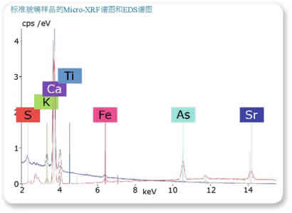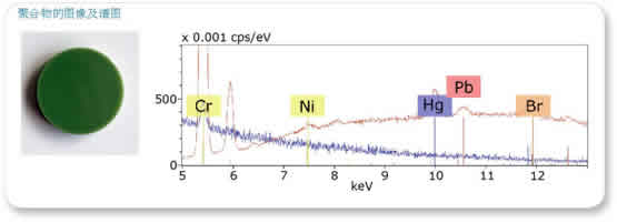 一種用于金屬及有害元素檢測(cè)測(cè)試的標(biāo)準(zhǔn)有機(jī)物光學(xué)圖像照片ƒ(左) 和譜圖 (右)。微區(qū) XRF譜圖ƒ(紅色) 顯示了 Ni、Hg、Pb及 Br等痕量元素的存在。而這些元素利用 EDSƒ (藍(lán)色) 均無(wú)法探測(cè)出來(lái)。兩種譜圖的采集條件相同,均為輸入計(jì)數(shù)率 6 kcps的情況下采集了300秒。