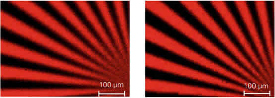(樣品:鉻星狀線條掃描步長(zhǎng): 25 µm左圖:樣品臺(tái)未傾斜右圖:樣品臺(tái)傾斜 30°以朝向X射線源,顯示了更好的空間分辨率。)