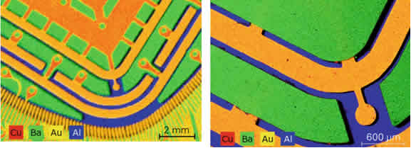 (Micro-XRF (左)和EDS (右) 的多重元素面分布圖。圖中顯示了 Cu元素、 Ba元素、 Au元素和Al元素。從兩圖對(duì)比可以看出,Au元素存在的位置遠(yuǎn)比能譜儀元素面分布圖中所顯示的多。)