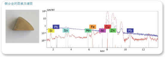 (銅合金照片(左)及其 XRF譜圖和EDS譜圖的比較(右)。從紅色XRF譜圖中可看到該樣品中存在很多的痕量元素。從 XRF譜圖的定量分析結(jié)果可知該樣品為黃銅 (CuZn33)。)