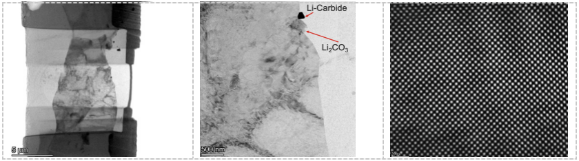如果希望對鋰金屬進行原子尺度的表征,需要進行TEM樣品制備。傳統的Ga離子在室溫下會與鋰金屬發生反應,難以用于鋰金屬的加工。Thermo Scientific研發的氙氣等離子氣體源的PFIB(Plasma FIB)可以實現鋰金屬透射樣品的無損制備。為了避免鋰金屬暴露在空氣中造成表面氧化,使用了CleanConnect進行樣品傳輸,隨后使用Cryo-PFIB技術進行樣品冷凍制備和進一步的觀察。圖6是利用Cryo-PFIB技術在-178℃進行鋰金屬樣品的TEM樣品制備過程以及在TEM中觀察到的樣品形貌信息。圖7TEM明場像中可以看到Li的碳化物與Li2CO3的分布,利用高分辨成像可以看到清晰的鋰原子排列,可見在切割和轉移過程中樣品并未受到損傷或氧化。